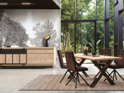 Le style tendance est caractérisé par l’utilisation de matériaux brutes, principalement le bois et le métal. On y retrouve ainsi des tables bois massif, des tables plateau bois pied métal, des buffets bois brut et des chaises en bois ou des chaises en cuir. De nombreux meubles reprennent le style industriel, qui utilise le bois et le métal.